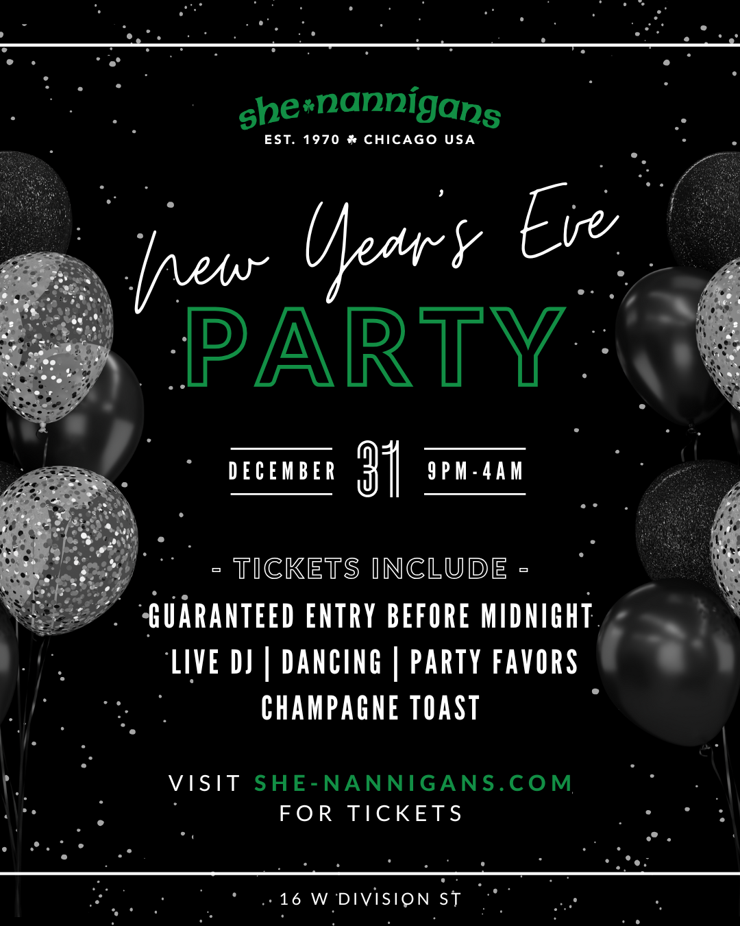 Time to ring in 2026 at She-nannigans! Your ticket includes guaranteed entry before midnight, a live DJ, huge dance floor, party favors, and a champagne toast at midnight! Get your ticket today to dance in the new year with friends!